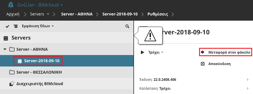 Εάν ο BIMcloud Server ή ο BIMcloud Manager βρίσκεται σε έναν φάκελο, πρέπει να τον μετακινήσετε στη Ρίζα Servers: