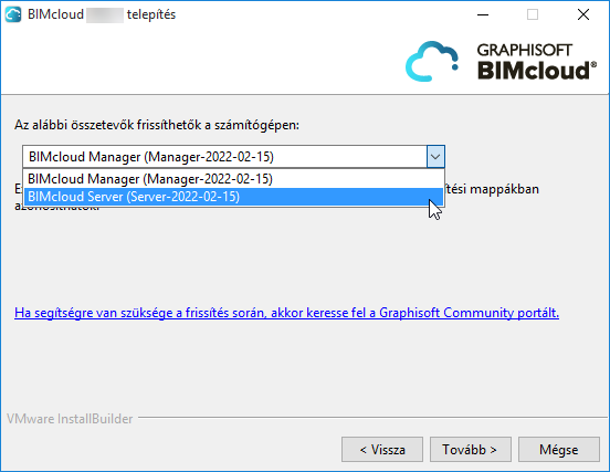 - A frissíthető összetevők az előugró ablakban láthatók. Válasszon egyet a frissítéshez (pl. BIMcloud Manager vagy BIMcloud Server). Kattintson a Következő gombra.