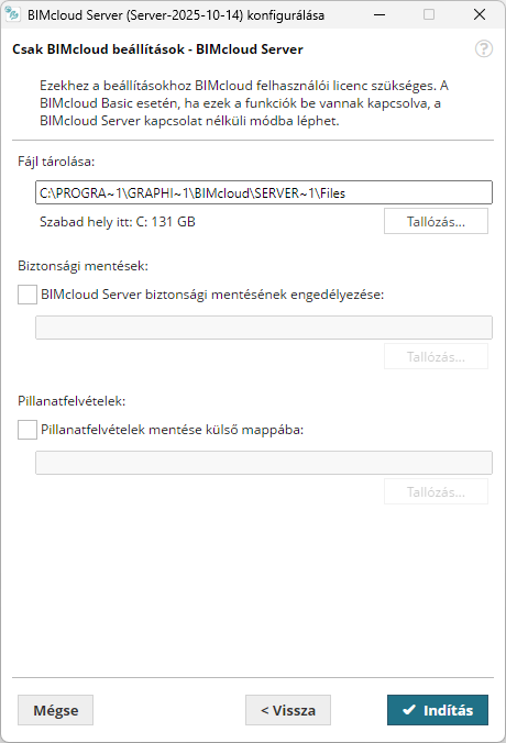 - A BIMcloud Server biztonsági mentésének engedélyezése: jelölje be ezt a négyzetet, amennyiben biztonsági másolatokat kíván létrehozni a BIMcloud Server adataiból. Ezt követően be kell írnia (vagy meg kell keresnie) a Biztonsági mentések mappájának útvonalát.