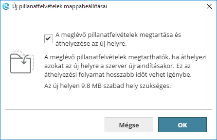 - Jelölje be a Pillanatfelvételek megtartása és áthelyezése: négyzetet és helyezze át a meglévő pillanatfelvételeket az imént meghatározott mappába. Amennyiben ezt a négyzetet jelöletlenül hagyja, a régi helyről valamennyi meglévő pillanatfelvétel törlésre kerül.
