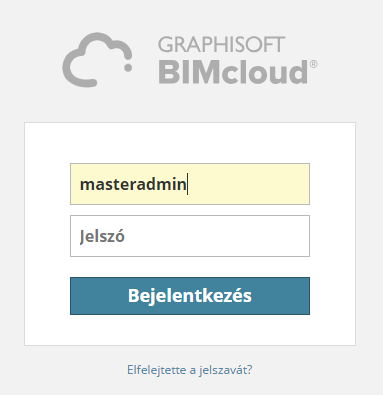 A Vezető rendszergazda felhasználóneve: masteradmin. A jelszó a szerver telepítésekor lett megadva a BIMcloud Manager konfiguráló ablakában. Ha elfelejtette a jelszót, nyissa meg újra a BIMcloud Manager konfiguráló ablakát, és adjon meg egy új jelszót.