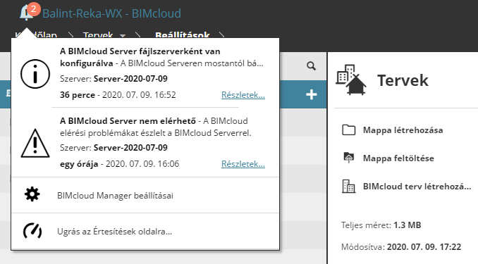 A fejléc tartalmazza a BIMclouddal kapcsolatos értesítéseket, valamint a BIMcloud beállításokra mutató parancsikonokat.