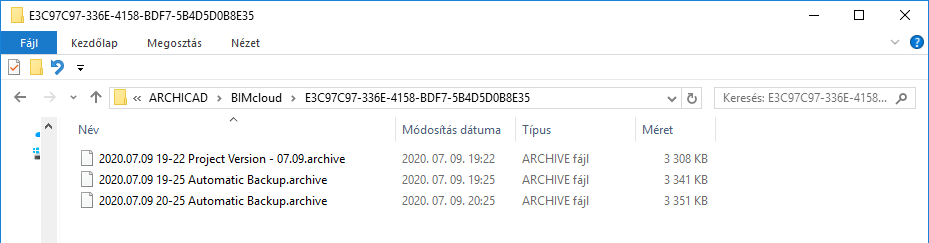 A könyvtárról készült pillanatfelvételek a Mellékletek > [ID-szám] > Másolatok mappába kerülnek, arra a helyre, ahova a BIMcloud Servert telepítette (ugyancsak .archive kiterjesztéssel).