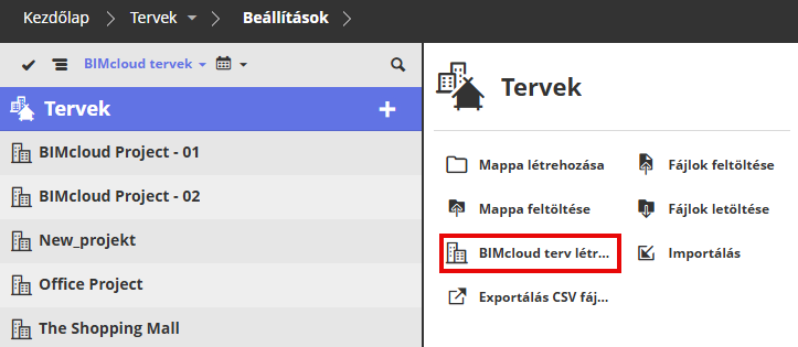 Ugorjon a BIMcloud Manager Tervek oldalára.