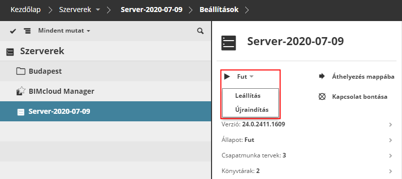 Állapot: A BIMcloud Server aktuális állapotát jelzi: