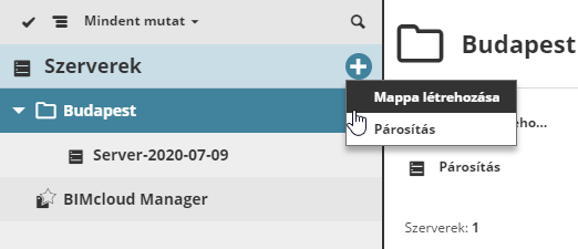 A BIMcloud Manager Szerverek oldalán, kattintson a Mappa létrehozása opcióra, majd adja meg az új mappa nevét a felugró párbeszédablakban. Ügyeljen arra, hogy az új mappa neve eltérjen a mappán belül található többi mappáétól.