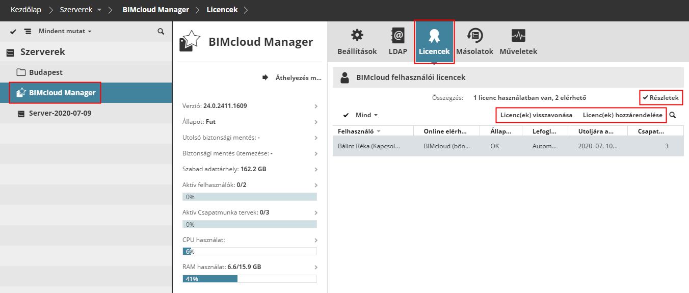 Itt láthatók az éppen használt, elérhető és hiányzó BIMcloud Felhasználói Licencek.