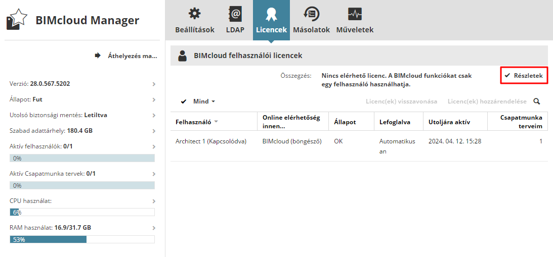 A BIMcloudhoz tartozó összes licenc áttekintéséhez kattintson a Részletek gombra: