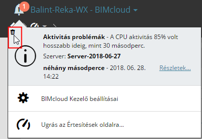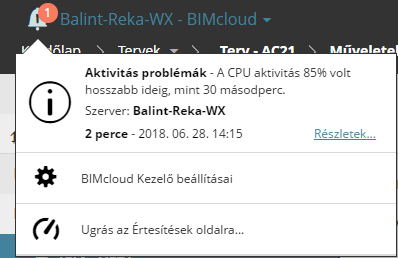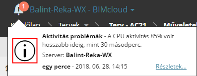 Az értesítések felugró ablakban is megjelennek a BIMcloud Manager megfelelő részein: