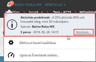 az Értesítések legördülő menüben (csengő ikon) a BIMcloud Manager minden oldalán