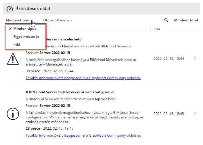 az Értesítések vezérlőpulton (a BIMcloud Manager külön oldala)
