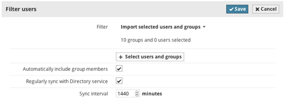 Jelölje be a “Szinkronizálás a mappaszolgáltatóval szabályos időközönként” jelölőnégyzetet a Felhasználók szűrése részben, majd adja meg a kívánt időintervallumot percben. A módosítások tárolásához kattintson a Mentés gombra.