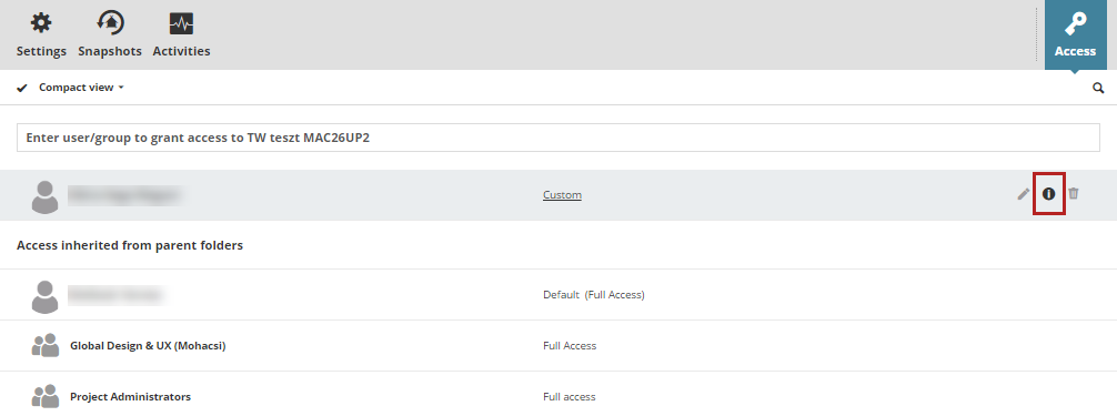 - The top part of the list displays users/groups if they were granted access to this particular item (the admin added their name manually - see Grant access)