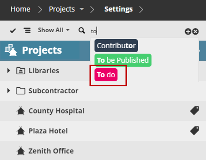 Click on the desired tag to add it to the search filter, or start typing a tag name (e.g. “To do”).