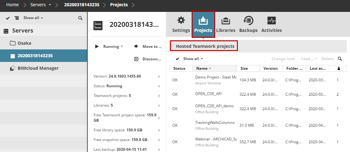 On the Servers page, Projects and Libraries panels are available for a selected BIMcloud Server or folder.