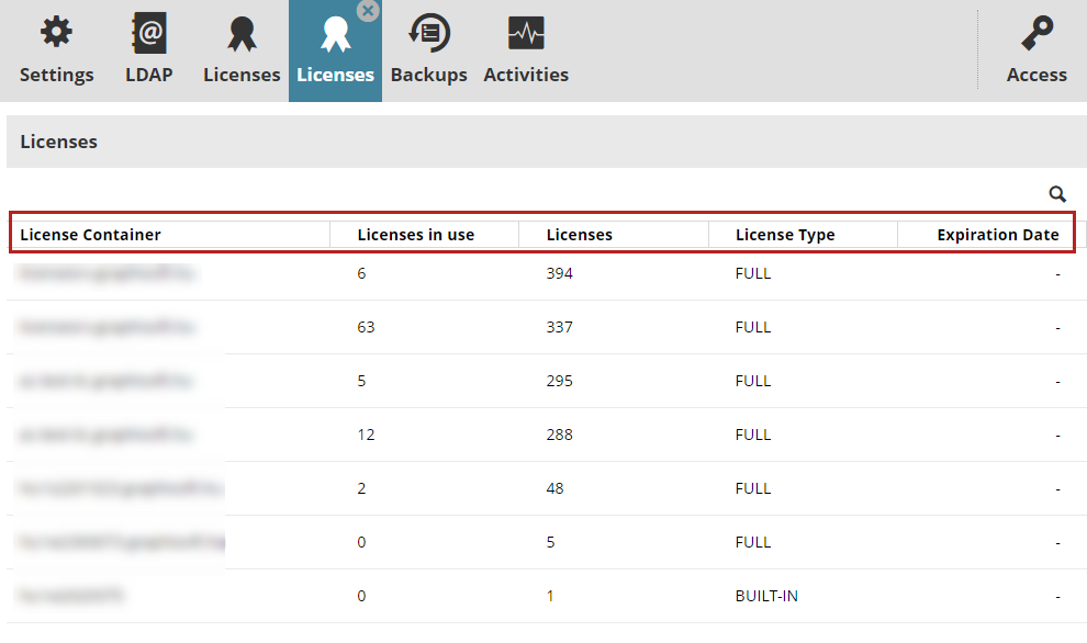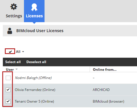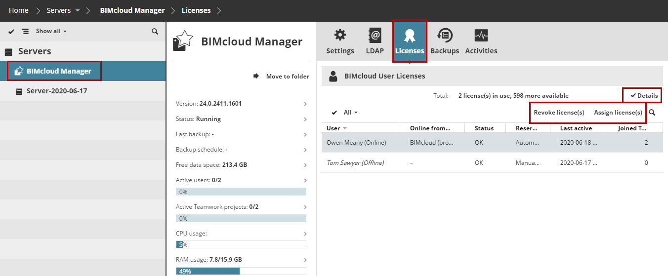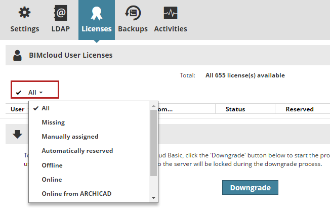 This gives an overview about the currently used, available, and missing BIMcloud User Licenses.