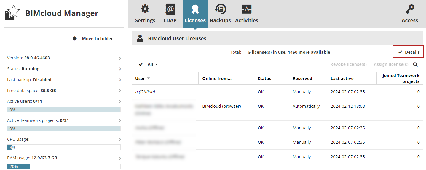 Click the Details button to get overview info for all the licenses of your BIMcloud: