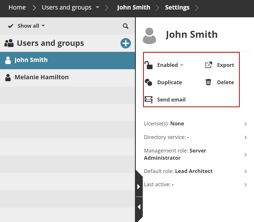 From the Users and groups page of BIMcloud Manager, you can view and filter the user list and create user groups. Other available functions vary depending on what you have selected in the Navigator (user or user group):
