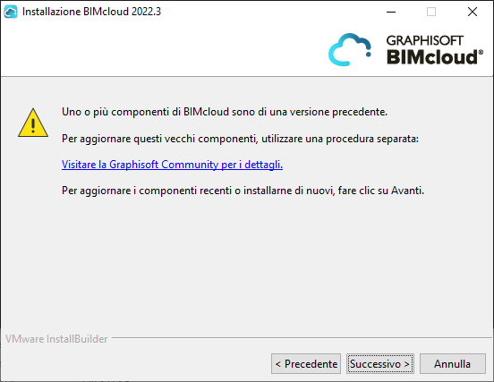 Se uno dei componenti BIMcloud esistenti è una versione precedente (obsoleto), il programma di installazione avvisa che non è possibile aggiornarlo direttamente dal programma di installazione: