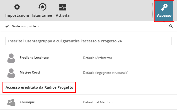- Nella sezione inferiore ("Accesso ereditato dalle cartelle superiori") sono visualizzati gli utenti/gruppi che possono accedere a questo elemento perché hanno già accesso alla cartella superiore. L'accesso attribuito ad un livello superiore della gerarchia delle cartelle è ereditato verso il basso da tutti i suoi elementi sottostanti.