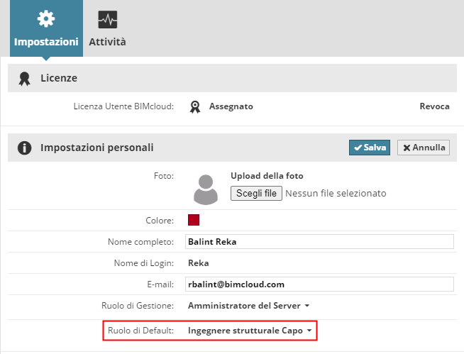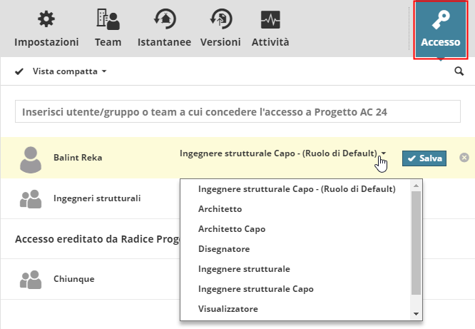 Quando si concede l'accesso a un utente nel pannello Accesso, l'utente assume questo ruolo predefinito, a meno che non gli si assegni un ruolo diverso.