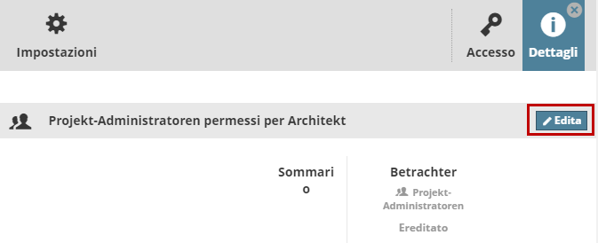 La pagina Dettaglio verrà così aperta automaticamente e sarà possibile scegliere i permessi voluti come parte del ruolo personale dell'utente/gruppo selezionato (vedere sotto).
