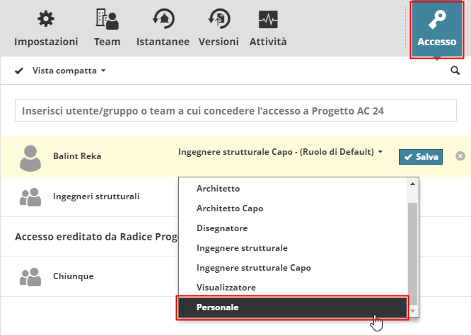 A volte è più facile assegnare determinati permessi localmente ad una persona per un certo elemento senza salvare questo insieme di permessi come un nuovo ruolo generico. In questo caso, quando si fornisce l'accesso, selezionare Personale nel menu di scelta rapida e fare clic su Salva.
