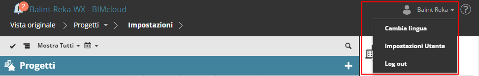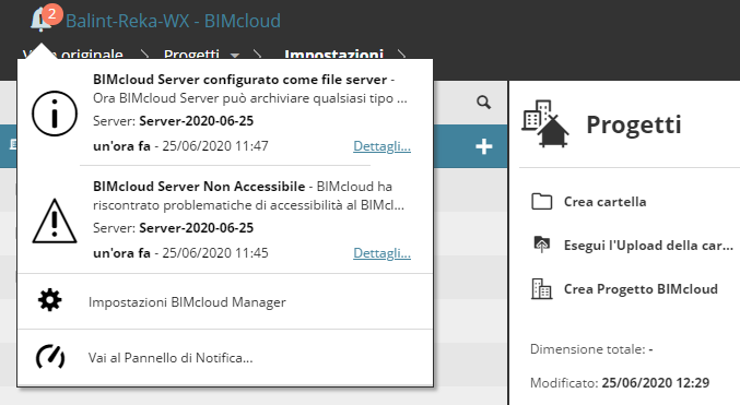 L'intestazione contiene notifiche sul BIMcloud e collegamenti a impostazioni BIMcloud.