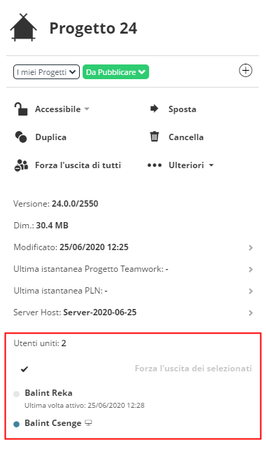 Sulla pagina dei progetti di BIMcloud Manager, selezionare un progetto Teamwork. Sono elencati gli utenti correntemente uniti al progetto. Il colore del punto indica lo stato di ciascun utente per questo progetto:
