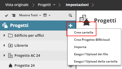 Questa funzione è disponibile sulla pagina Progetti, se è selezionata la cartella radice o un'altra cartella qualsiasi.