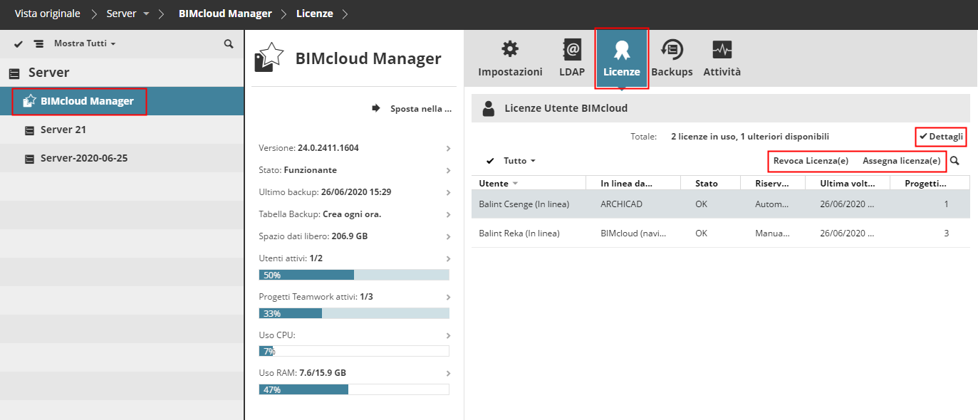 Panoramica delle licenze sul proprio BIMcloud