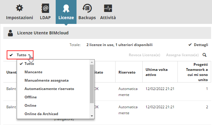 Questo fornisce una panoramica sulle Licenze Utente BIMcloud correntemente utilizzate, disponibili e mancanti.