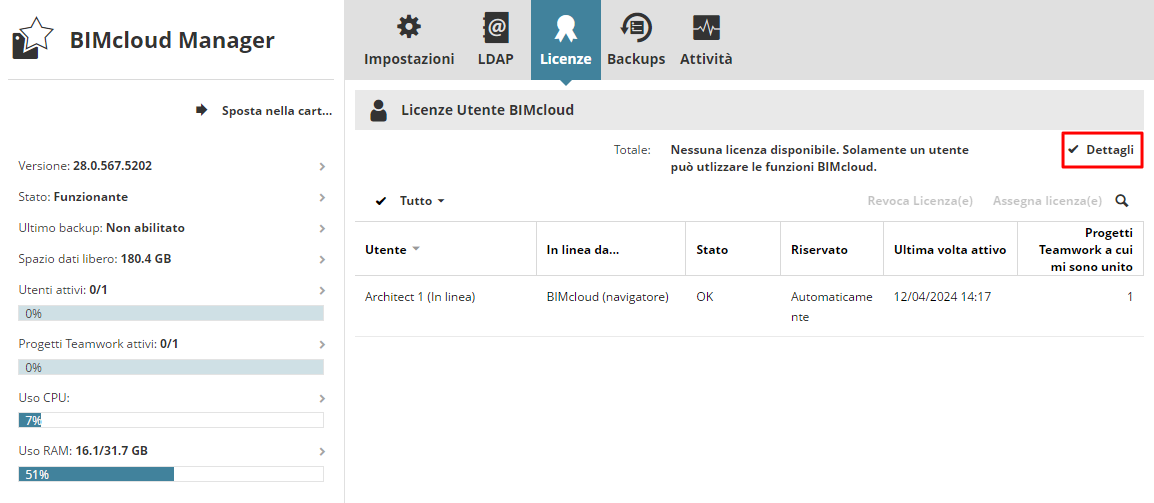 Fare clic sul pulsante Dettagli per ottenere informazioni generali su tutte le licenze del proprio BIMcloud: