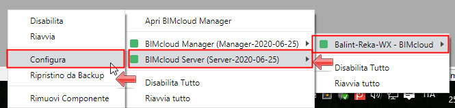 Per verificare quali siano queste posizioni, individuare l'icona del BIMcloud Server nella barra applicazioni. Fare clic col tasto destro del mouse, trovare il componente voluto e fare clic su Configura tra i comandi disponibili