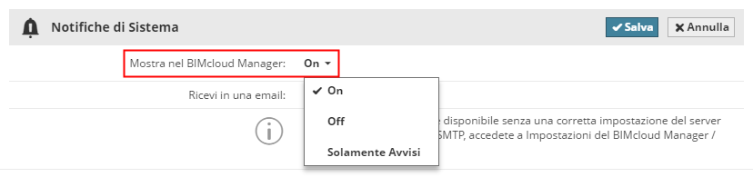 Off: Le notifiche di sistema non compariranno in alcun punto dell'interfaccia del BIMcloud Manager.