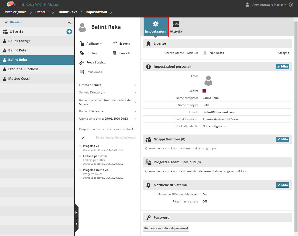 Elenca i Progetti BIMcloud e i Team associati a ai quali questo utente appartiene.