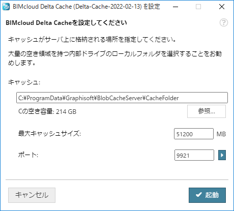 キャッシュフォルダ:The BIMcloud Delta Cacheはこのフォルダに一時的にキャッシュされたデータを格納します。パスを入力するか、[参照]をクリック。