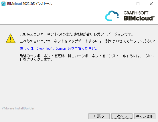 既存のBIMcloud構成部品のいずれかが古い(旧式の)バージョンである場合、インストーラから直接それらを更新することができないという警告が表示されます。