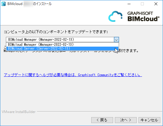 - アップデート可能なコンポーネントがポップアップでリストされます。アップデートするコンポーネントを1つ選択します(例:BIMcloud ManagerまたはBIMcloud Server)。[次へ]をクリックします。