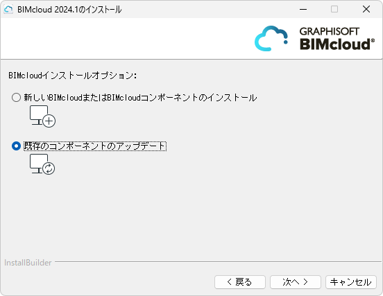 BIMcloudインストーラを起動すると、既存のBIMcloudコンポーネント(BIMcloud Manager、BIMcloud Server、Delta Cache)がコンピュータで自動的に確認され、アップデートが利用可能なものがリストされます。