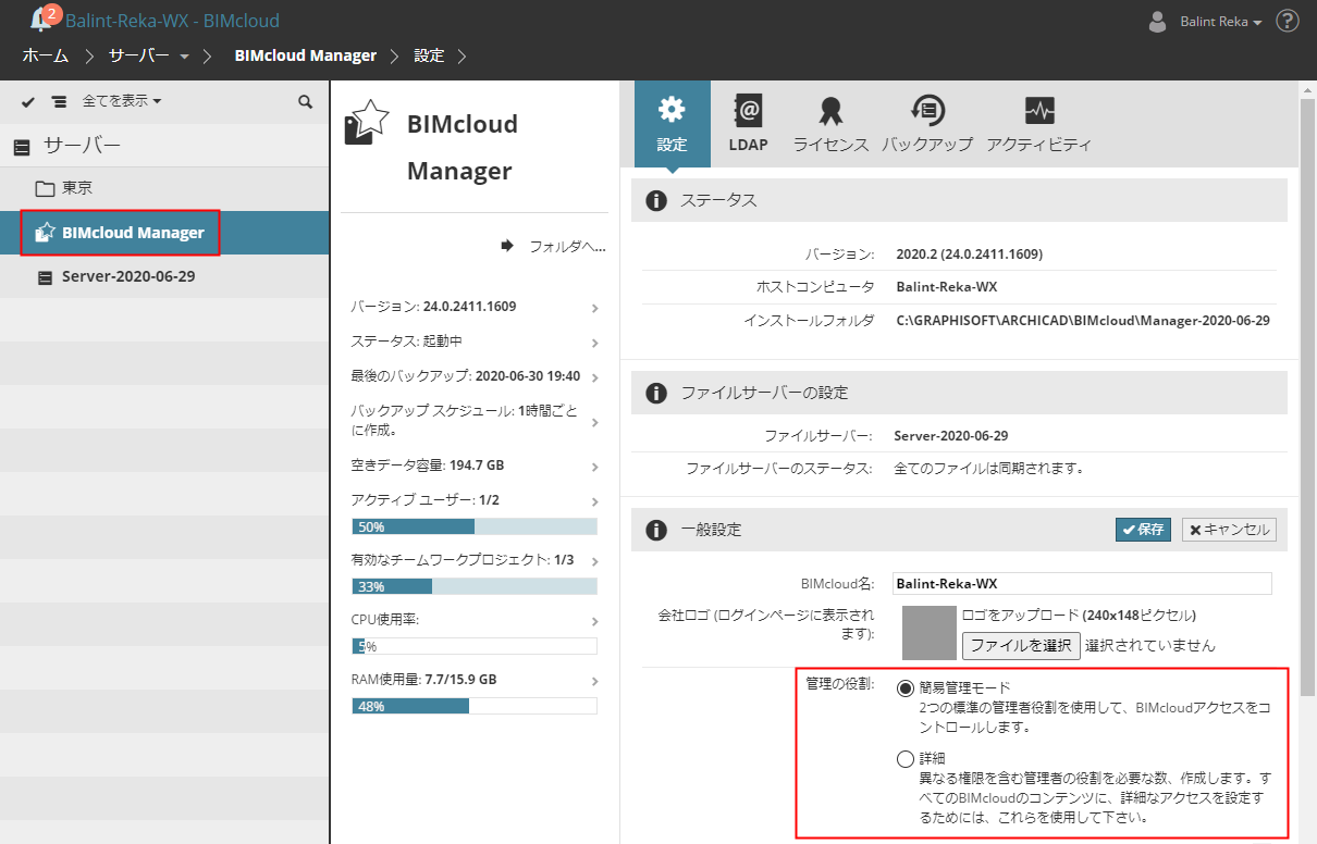 BIMcloudでは、BIMcloud管理者の役割として2つのアプローチ:簡易管理と詳細管理があります。