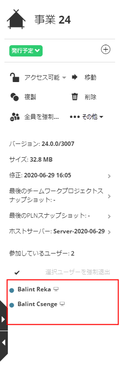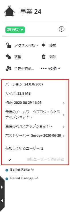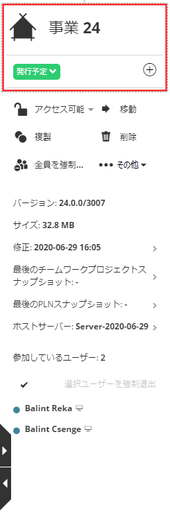BIMcloud Managerで項目を選択すると、概要セクションにクイック情報と関連機能が表示されます。