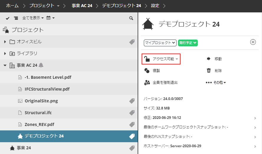 BIMcloudのプロジェクトページでは、選択したプロジェクトのステータスが表示されます。