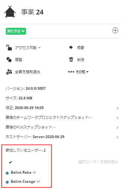 BIMcloud Managerのプロジェクトページで、チームワークプロジェクトを選択します。現在参加済みのユーザーがリストアップされます。点の色は、このプロジェクトでの各ユーザーのステータスを表します。