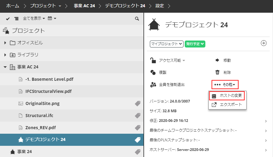 BIMcloudで、あるホストサーバーから他のホストサーバーにチームワークプロジェクトまたはライブラリのデータを移動するには、[ホストの変更]を使用します。