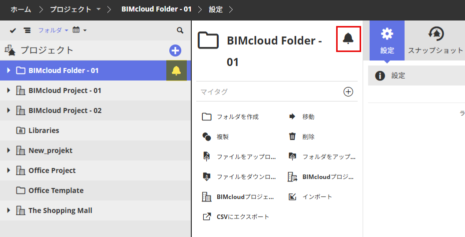 BIMcloud Managerの[プロジェクト]ページで項目をサブスクライブし、ファイルとフォルダの変更をBIMcloudで追跡します。「フォルダ」の場合は、通常のフォルダ、BIMcloudプロジェクト、ライブラリフォルダでこれが可能です。