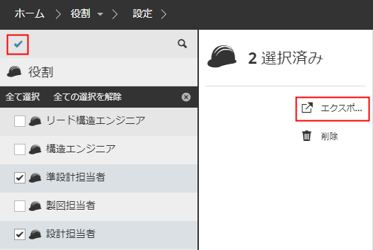 - エクスポートする役割を選択します.注: 注記:ナビゲータで項目を複数選択するには、ページの上部にあるチェックマークをクリックしてチェックボックスをオンにします。