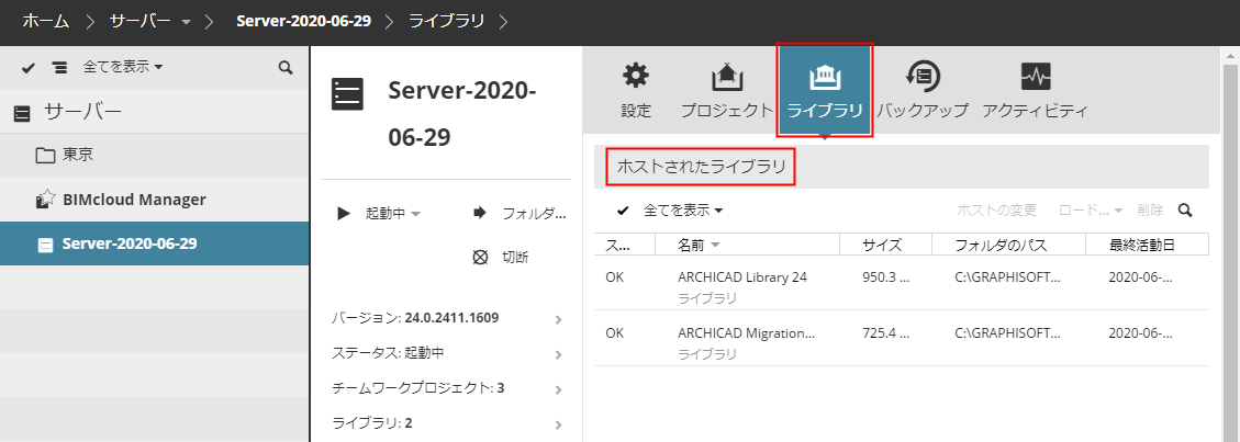 [サーバー]ページでは、選択したBIMcloud Serverまたはフォルダに対して[プロジェクト]および[ライブラリ]パネルを使用できます。