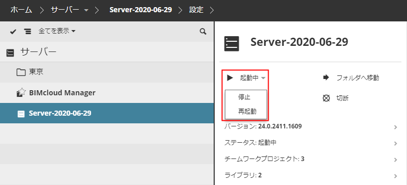 状態:BIMcloud Serverの現在のステータスが示されます: