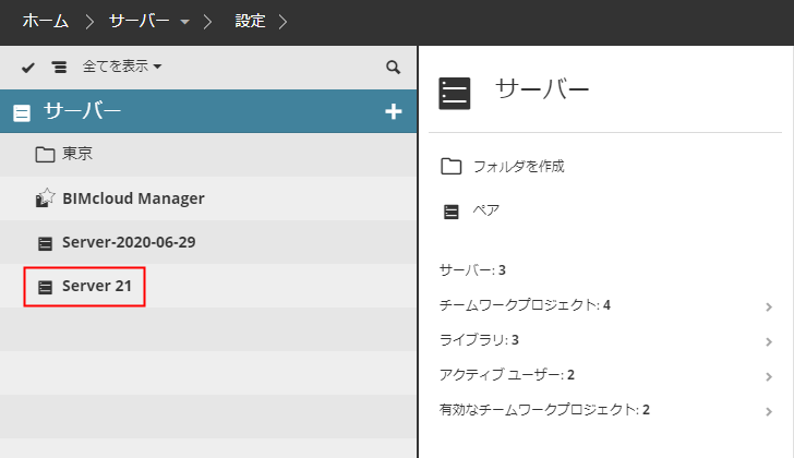 BIMcloud ServerがBIMcloud Managerのナビゲータに自動的に表示されます。